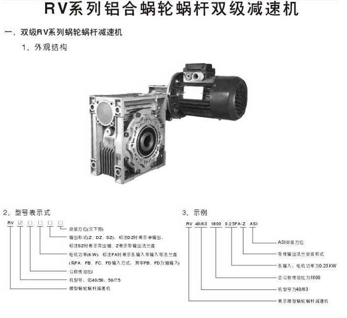 RV系列鋁合金蝸輪蝸桿雙級減速機雙級RV系列鋁合金蝸輪蝸桿減速機外觀結(jié)構型號表示法