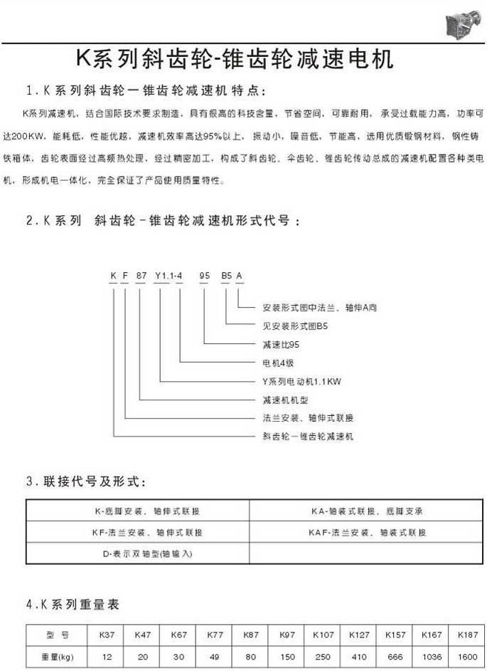 K系列斜齒輪-錐齒輪減速機(jī)特點型號表示法聯(lián)結(jié)代號及形式重量表